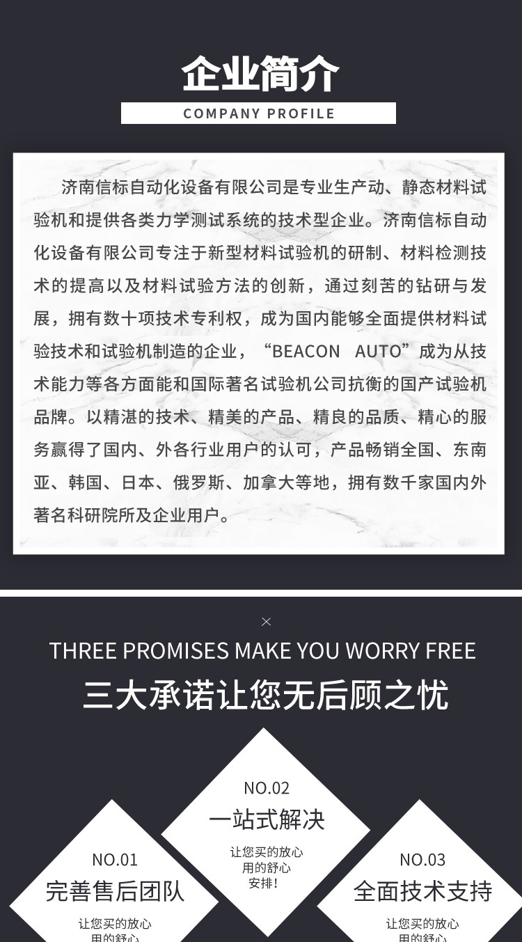 濟南信標自動化設備有限公司主要生產:動靜態萬能疲勞試驗機,接骨板彎曲試驗機,縫合線拉伸疲勞試驗機,髖膝關節磨損試驗機,電子萬能試驗機、液壓萬能試驗機、巖石三軸、四軸,電液拉力試驗機,材料試驗機,高低溫蠕變,高低頻疲勞,拉伸、扭轉、杯突等二十多個系列兩千多個的品種。