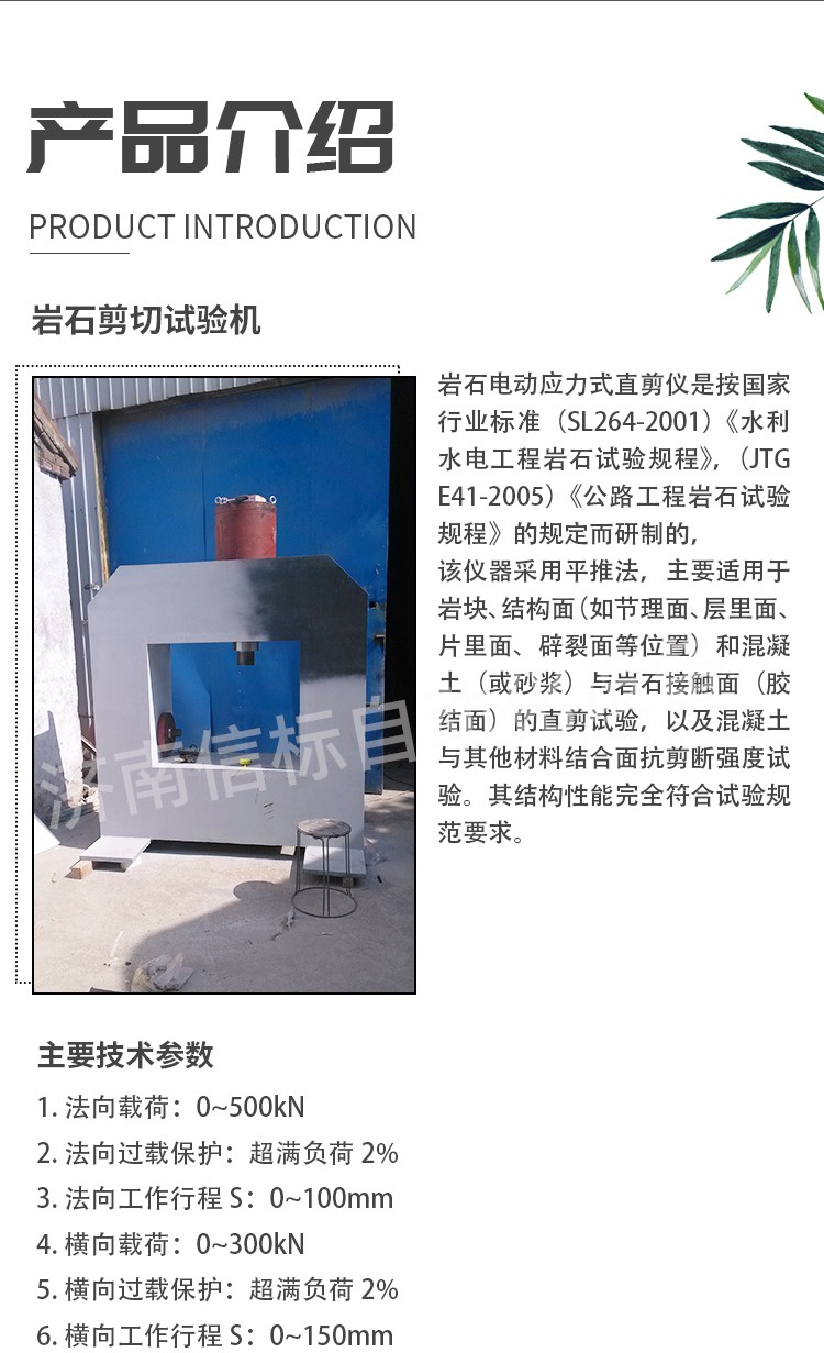 主要技術參數: ?法向載荷:0~500kN ?法向過載保護:超滿負荷2% ?法向工作行程S:0~100mm ?橫向載荷:0~300kN ?橫向過載保護:超滿負荷2% ?橫向工作行程S:0~150mm ?法向空間 : ≤450mm ?橫向空間 : ≤200mm ?剪切載荷速度:0~30KN/S(可調) ?載荷指示方式:微機屏顯 ?載荷指示精度:0.1KN ?位移測量:微機采集 ?加載方式: ?法向:微機控制電液伺服閥門(也可手動進行); ?橫向:手動液壓閥; ?聯想電腦一臺(CL E3400 1G DDR2 160G DVD 19”液晶) ?HP噴墨打印機一臺 ?電機功率:1kW+1kW ?工作電壓:三相四線制 380V 50Hz(三火一零) ?整機重量:2200kg ?外形尺寸:1500×900×1735mm Equipment working conditions設備工作條件: 1.Power supply(電源):Three phase and Four wire(三相四線制); three live wire, one zero line(三火線一零線) 2.Wiring definition(接線定義):Brown - live wire, Yellow - live wire, Blue - live wire,Black – zero line 棕-火線,黃-火線,藍-火線,黑-零線; 3.Main motor power(主機功率):2.2kW(千瓦) Total; 4.Max . Normal load (最大法向力):500kN(千牛); 5.Max. Lateral load(最大橫向/剪切力):300kN(千牛); 6.hydraulic oil(液壓油):46# Hydraulic Oil@cold area or season; 68# Hydraulic Oil@hot area or season; 46#抗磨液壓油@寒冷地區或季節;68#抗磨液壓油@炎熱地區或季節; oil bearing(耗油量):40L(公升); 7.Weight of machine(主機重量):about 2000kg;約2噸; 8.在無震動環境中。 9.電源電壓波動范圍小于額定電壓的±10%。 10.地基應平整、牢固。 試機: 1.加油:油液采用46#號抗磨液壓油,加油孔在儀器左后方,將左后方蓋板打開,將油箱上方加油口保護罩打開,加油即可,油量在40L左右。 2.接電:請牢固連接三相電源,不可缺相。