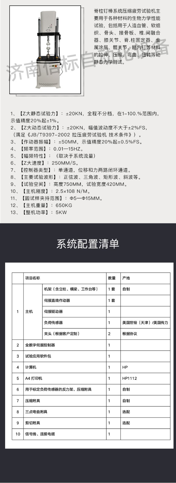 濟南信標自動化設備有限公司主要生產:動靜態萬能疲勞試驗機,接骨板彎曲試驗機,縫合線拉伸疲勞試驗機,髖膝關節磨損試驗機,電子萬能試驗機、液壓萬能試驗機、巖石三軸、四軸,電液拉力試驗機,材料試驗機,高低溫蠕變,高低頻疲勞,拉伸、扭轉、杯突等二十多個系列兩千多個的品種。