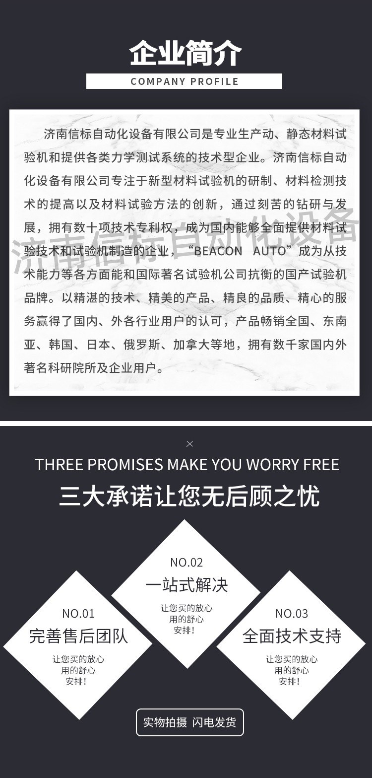 濟南信標自動化設備有限公司主要生產:動靜態萬能疲勞試驗機,接骨板彎曲試驗機,縫合線拉伸疲勞試驗機,髖膝關節磨損試驗機,電子萬能試驗機、液壓萬能試驗機、巖石三軸、四軸,電液拉力試驗機,材料試驗機,高低溫蠕變,高低頻疲勞,拉伸、扭轉、杯突等二十多個系列兩千多個的品種。