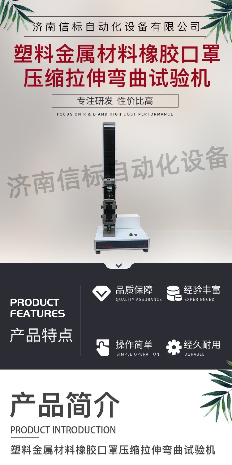 金屬材料壓縮彎曲實驗口罩塑料拉伸強度試驗機主要功能及特點: 1、主機: 1.1調速系統采用伺服電機和自主研發減速系統,性能穩定可靠,具有過流、過壓、過載等保護裝置。調速范圍可達0.05~500mm/min。 1.2傳動部分采用圓弧同步齒形帶,精密絲杠副傳動,傳動平穩,噪音低,傳動效率高。 1.3萬向節采用十字插銷結構,而且具有擺角限制功能,一方面便于試樣夾持,保證試驗同心度,另一方面很好的消除了不規則試樣對傳感器的影響。 2、控制系統、操作軟件及數據處理系統 2.1計算機控制系統,具有集成度高、性能穩定、調整方便等優點??梢詫嶒灁祿M行實時采集,對實驗特性曲線實現實時動態顯示,試驗數據文件能以Access常用數據庫或SQLserve大型數據庫的方式保存,方便實現客戶的資源共享及網絡管理,以及用戶的再分析。對于用戶自定義的各種word2000報表,該軟件可輕松實現訪問,解決了不同用戶或同一用戶在不同時期對試驗報表有不同需要的難題。該軟件可處理試驗力、位移、時間、變形的原始數據及由此派生的曲線。
