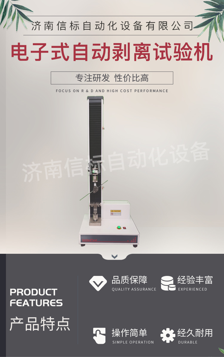 高強度膠黏劑膠帶浮棍法90度180度剝離強度試驗機主要功能及特點: 1、主機: 1.1調速系統采用伺服電機和自主研發減速系統,性能穩定可靠,具有過流、過壓、過載等保護裝置。調速范圍可達0.05~500mm/min。 1.2傳動部分采用圓弧同步齒形帶,精密絲杠副傳動,傳動平穩,噪音低,傳動效率高。 1.3萬向節采用十字插銷結構,而且具有擺角限制功能,一方面便于試樣夾持,保證試驗同心度,另一方面很好的消除了不規則試樣對傳感器的影響。 2、控制系統、操作軟件及數據處理系統 2.1計算機控制系統,具有集成度高、性能穩定、調整方便等優點??梢詫嶒灁祿M行實時采集,對實驗特性曲線實現實時動態顯示,試驗數據文件能以Access常用數據庫或SQLserve大型數據庫的方式保存,方便實現客戶的資源共享及網絡管理,以及用戶的再分析。對于用戶自定義的各種word2000報表,該軟件可輕松實現訪問,解決了不同用戶或同一用戶在不同時期對試驗報表有不同需要的難題。該軟件可處理試驗力、位移、時間、變形的原始數據及由此派生的曲線。