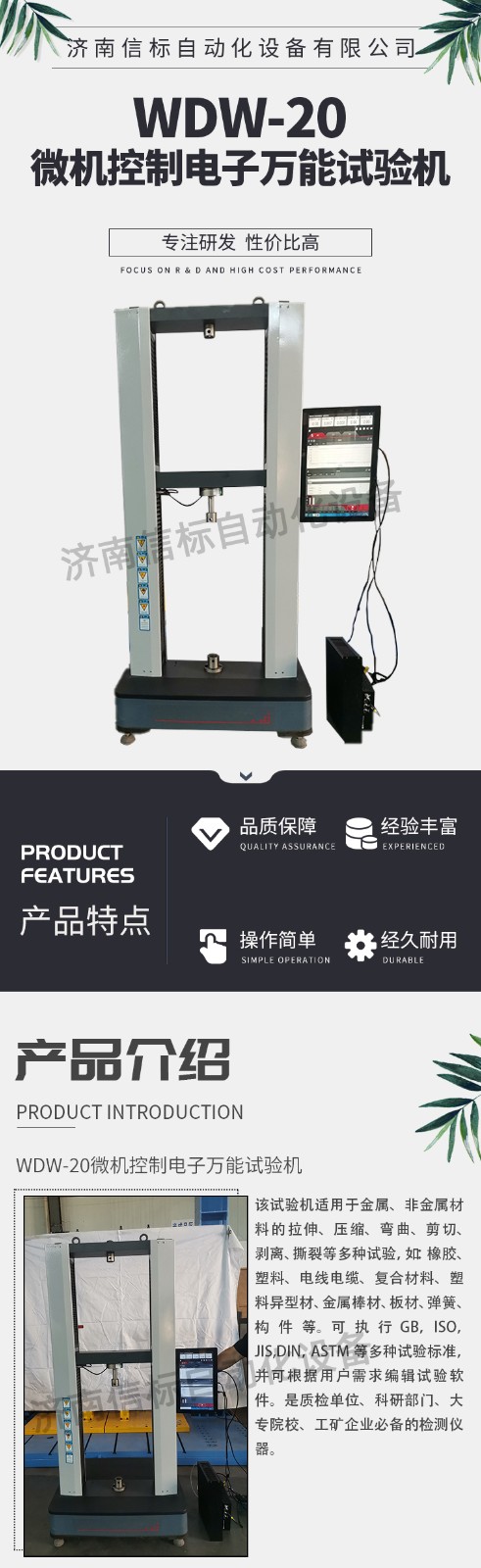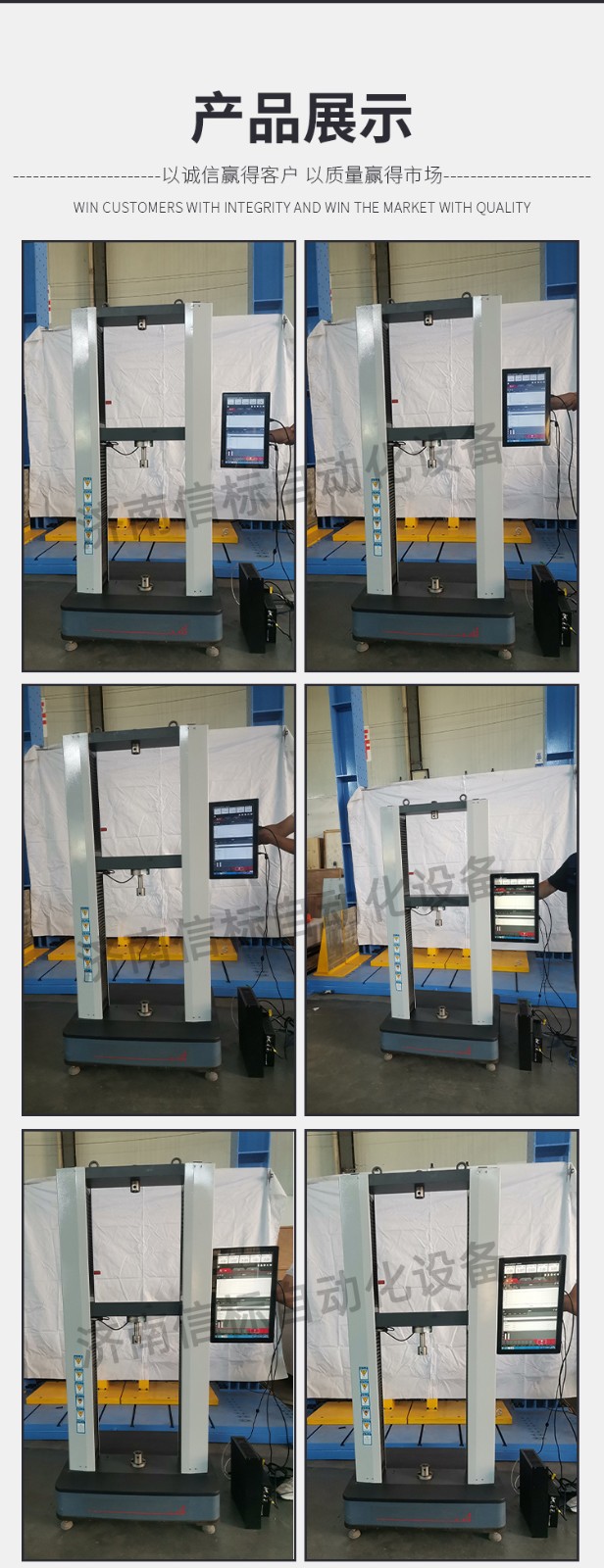 WDW-20微機控制電子萬能試驗機材料抗拉強度拉伸測試儀器測量參數: 1. 最大試驗力: 10/20/30/50kN 2. 試驗力測量范圍: 0.4%--100%。 3. 試驗力示值精度:優于示值±1% 4. 試驗力分辨力:1/500000 5. 橫梁位移測量精度:分辨率高于0.0025mm 6. 變形測量精度: ±0.5% 7. 試驗速度范圍:0.0002—500mm/min,無級調速 8. 速度控制精度:±1%(0.0002~50mm/min); ±0.5%(50~3500mm/min) 9. 恒力、恒變形、恒位移控制范圍: 0.2%-100%FS 10.恒力、恒變形、恒位移控制精度: 設定值<10%FS時,設定值的±1.0%以內 設定值≥10%FS時,設定值的±0.1%以內 11. 變形速率控制精度: 速率<0.05%FS時為±2.0%設定值內 速率≥0.05%FS時為±0.5%設定值內 12. 試驗空間: A.拉伸空間:1000mm B.壓縮空間:1100mm C.寬度:450mm 13.下工作臺:450*250 14. 壓盤尺寸:φ100 mm 15. 整機電源:單相,220V±10%,50Hz,功率:750 W 16. 工作環境:室溫—35℃,相對濕度不超過80% 17. 主機尺寸: 870×730×1750mm 18. WDW-20微機控制電子萬能試驗機材料抗拉強度拉伸測試儀器重量:400 kg WDW-20微機控制電子萬能試驗機材料抗拉強度拉伸測試儀器產品配置: 1、主機 一套 2、松下A7全數字伺服電機及伺服驅動器; 一套 3、高精度負荷傳感器; 5kn/1kn/500N/200/ 各一支 4、Hiwin精密滾珠絲杠; 2支 5、光電編碼器(2500線,內置); 1支 6、夾具:滿足海綿/汽車座椅所需工裝 1套(有多種) 7、三閉環測量系統一套,采用力,位移,應變等多種控制方式,試驗過程中可實時顯示力-位移,力-時間,應力-應變等多種試驗曲線,并可自動得出最大負荷,拉伸強度,斷裂伸長率等多種結果參數。 8、HP品牌計算機,21寸液晶顯示器; 9、打印機:HPA4彩色噴墨打印機; 10、專用試驗軟件:可執行GB,ISO,JIS、DIN,ASTM等多種試驗標準,全開放式,功能強大,方便操作,免費提供升級軟件,并可根據用戶需求自行編輯試驗軟件。