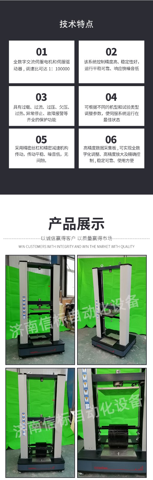 測量參數: 1. 最大試驗力: 10/20/30/50kN 2. 試驗力測量范圍: 0.4%--100%。 3. 試驗力示值精度:優于示值±1% 4. 試驗力分辨力:1/500000 5. 橫梁位移測量精度:分辨率高于0.0025mm 6. 變形測量精度: ±0.5% 7. 試驗速度范圍:0.0002—500mm/min,無級調速 8. 速度控制精度:±1%(0.0002~50mm/min); ±0.5%(50~3500mm/min) 9. 恒力、恒變形、恒位移控制范圍: 0.2%-100%FS 10.恒力、恒變形、恒位移控制精度: 設定值<10%FS時,設定值的±1.0%以內 設定值≥10%FS時,設定值的±0.1%以內 11. 變形速率控制精度: 速率<0.05%FS時為±2.0%設定值內 速率≥0.05%FS時為±0.5%設定值內 12. 試驗空間: A.拉伸空間:1000mm B.壓縮空間:1100mm C.寬度:450mm 13.下工作臺:450*250 14. 壓盤尺寸:φ100 mm 15. 整機電源:單相,220V±10%,50Hz,功率:750 W 16. 工作環境:室溫—35℃,相對濕度不超過80% 17. 主機尺寸: 870×730×1750mm 18. 重量:400 kg 產品配置: 1、主機 一套 2、松下A7全數字伺服電機及伺服驅動器; 一套 3、高精度負荷傳感器; 5kn/1kn/500N/200/ 各一支 4、Hiwin精密滾珠絲杠; 2支 5、光電編碼器(2500線,內置); 1支 6、夾具:滿足海綿/汽車座椅所需工裝 1套(有多種) 7、三閉環測量系統一套,采用力,位移,應變等多種控制方式,試驗過程中可實時顯示力-位移,力-時間,應力-應變等多種試驗曲線,并可自動得出最大負荷,拉伸強度,斷裂伸長率等多種 結果參數。 8、HP品牌計算機,21寸液晶顯示器; 9、打印機:HPA4彩色噴墨打印機; 10、專用試驗軟件:可執行GB,ISO,JIS、DIN,ASTM等多種試驗標準,全開放式,功能強大,方便操作,免費提供升級軟件,并可根據用戶需求自行編輯試驗軟件。