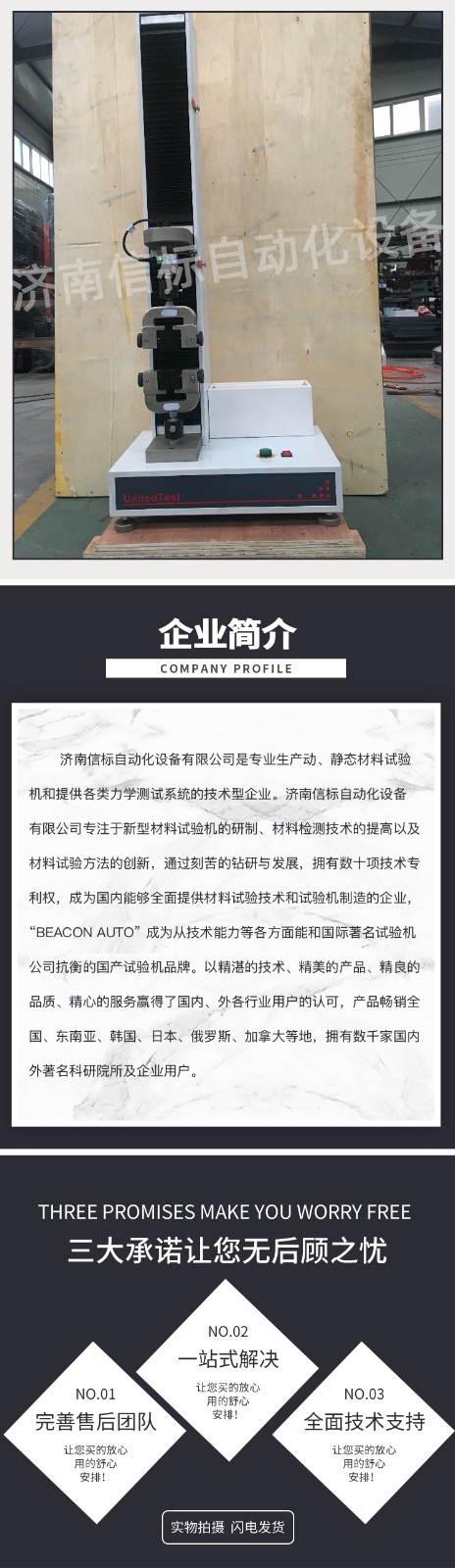 金屬材料壓縮彎曲實驗口罩塑料拉伸強度試驗機主要功能及特點: 1、主機: 1.1調速系統采用伺服電機和自主研發減速系統,性能穩定可靠,具有過流、過壓、過載等保護裝置。調速范圍可達0.05~500mm/min。 1.2傳動部分采用圓弧同步齒形帶,精密絲杠副傳動,傳動平穩,噪音低,傳動效率高。 1.3萬向節采用十字插銷結構,而且具有擺角限制功能,一方面便于試樣夾持,保證試驗同心度,另一方面很好的消除了不規則試樣對傳感器的影響。 2、控制系統、操作軟件及數據處理系統 2.1計算機控制系統,具有集成度高、性能穩定、調整方便等優點??梢詫嶒灁祿M行實時采集,對實驗特性曲線實現實時動態顯示,試驗數據文件能以Access常用數據庫或SQLserve大型數據庫的方式保存,方便實現客戶的資源共享及網絡管理,以及用戶的再分析。對于用戶自定義的各種word2000報表,該軟件可輕松實現訪問,解決了不同用戶或同一用戶在不同時期對試驗報表有不同需要的難題。該軟件可處理試驗力、位移、時間、變形的原始數據及由此派生的曲線。