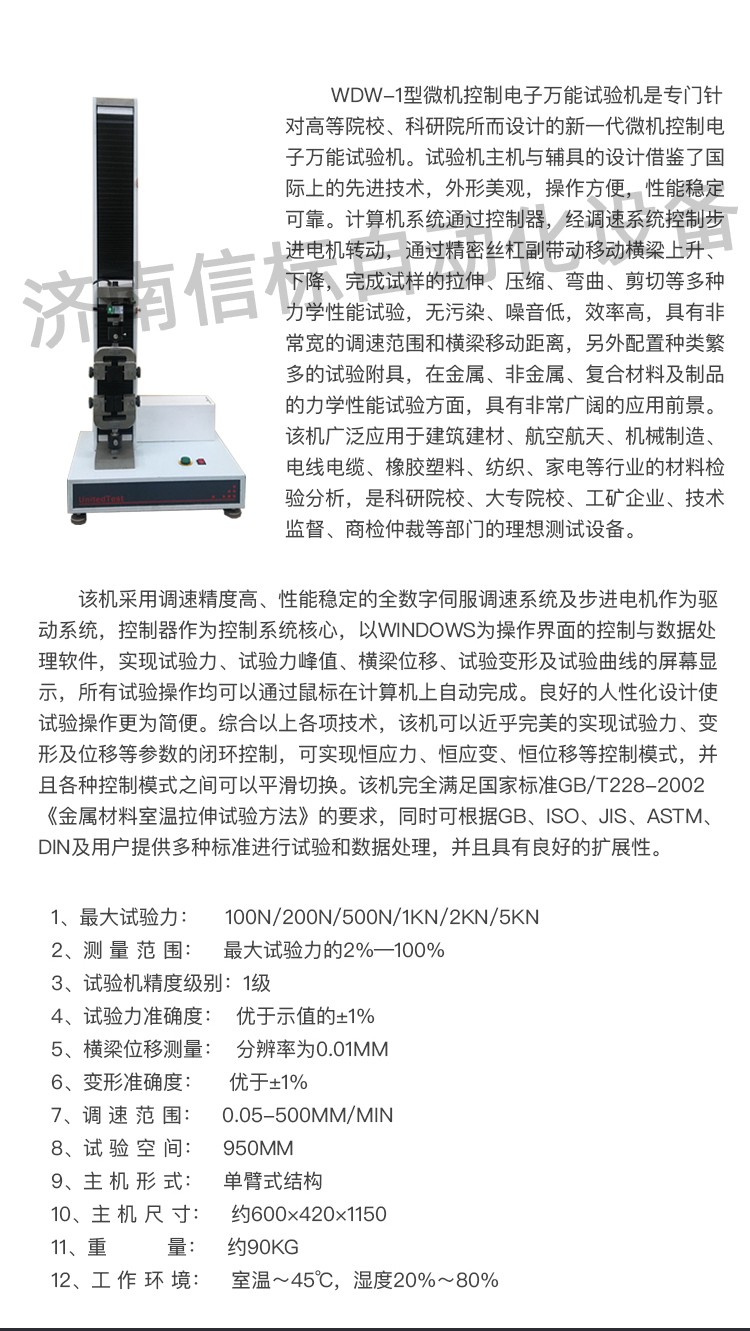 金屬材料壓縮彎曲實驗口罩塑料拉伸強度試驗機主要技術指標: 1、最大試驗力: 100N/200N/500N/1KN/2KN/5KN 2、測 量 范 圍: 最大試驗力的2%—100% 3、試驗機精度級別:1級 4、試驗力準確度: 優于示值的±1% 5、橫梁位移測量: 分辨率為0.01mm 6、變形準確度: 優于±1% 7、調 速 范 圍: 0.05-500mm/min 8、試 驗 空 間: 950mm 9、主 機 形 式: 單臂式結構 10、主 機 尺 寸: 約600×420×1150 11、重 量: 約90Kg 12、工 作 環 境: 室溫~45℃,濕度20%~80%