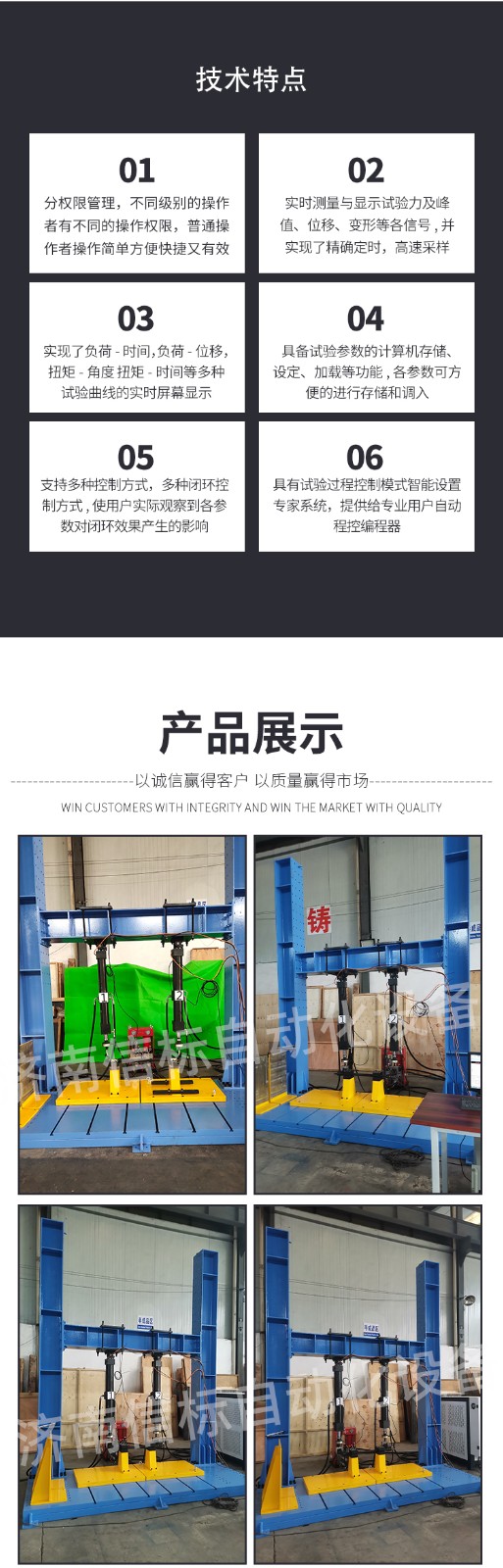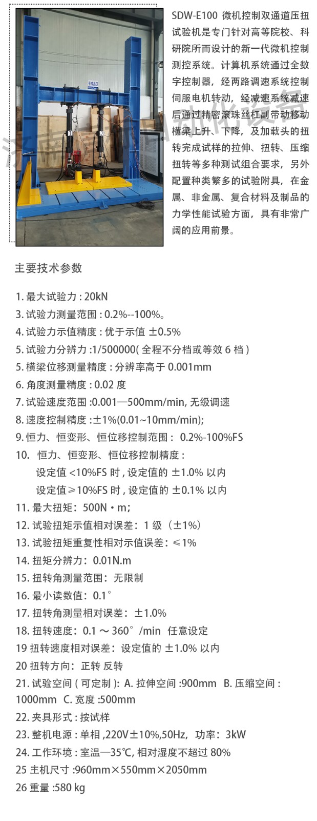主要技術指標: 1. 最大試驗力: 20kN 3. 試驗力測量范圍: 0.2%--100%。 4. 試驗力示值精度:優于示值±0.5% 5. 試驗力分辨力:1/500000(全程不分檔或等效6檔) 5. 橫梁位移測量精度:分辨率高于0.001mm 6. 角度測量精度: 0.02度 7. 試驗速度范圍:0.001—500mm/min,無級調速 8. 速度控制精度:±1%(0.01~10mm/min); 9. 恒力、恒變形、恒位移控制范圍: 0.2%-100%FS 10.恒力、恒變形、恒位移控制精度: 設定值<10%FS時,設定值的±1.0%以內 設定值≥10%FS時,設定值的±0.1%以內 11.最大扭矩:500N·m; 12.試驗扭矩示值相對誤差:1級(±1%) 13.試驗扭矩重復性相對示值誤差:≤1% 14.扭矩分辨力:0.01N.m 15.扭轉角測量范圍:無限制 16.最小讀數值:0.1° 17.扭轉角測量相對誤差:±1.0% 18.扭轉速度:0.1~360°/min 任意設定 19.扭轉速度相對誤差:設定值的±1.0%以內 20.扭轉方向:正轉 反轉 21. 試驗空間(可定制): A.拉伸空間:900mm B.壓縮空間:1000mm C.寬度:500mm 22. 夾具形式: 按試樣 23. 整機電源:單相,220V±10%,50Hz,功率:3kW 24. 工作環境:室溫—35℃,相對濕度不超過80% 25 主機尺寸:960mm×550mm×2050mm 26 重量:580 kg 主機 1.1主機采用高鋼度框架結構,強度高、變形??; 1.2 采用進口高精度滾珠絲杠,傳動高效平穩; 1.3 傳動部分采用圓弧齒同步帶傳動,傳動過程中雙向無間隙; 1.4 采用交流伺服電機及驅動系統,確保傳動平穩,力矩穩定,具有過流、過壓、過載等保護裝置,調速比可達1:100000; 1.5 夾具經特殊設計,夾持牢固,操作方便,無鉗口滑移現象; 1.6 特殊工藝保證試驗機同軸度,很好的消除了不規則試樣對傳感器的影響。 1.7NMRV高精度減速機,零背隙保證正反轉沒有間隙 1.8防耦合反力架,保證壓縮和扭轉時兩路傳感器互不影響。